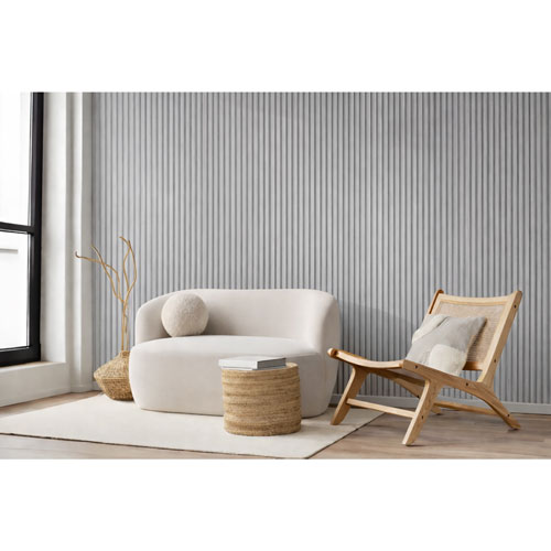 Panel decorativo de listones gris en acabado natural. Instalación rápida sin necesidad de obras, ideal para crear ambientes cálidos y elegantes con un toque de madera auténtica.